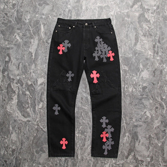 CHROME HEARTS PINK & CHECKERED CROSS PATCH FLEURKNEE JEANS BLACK