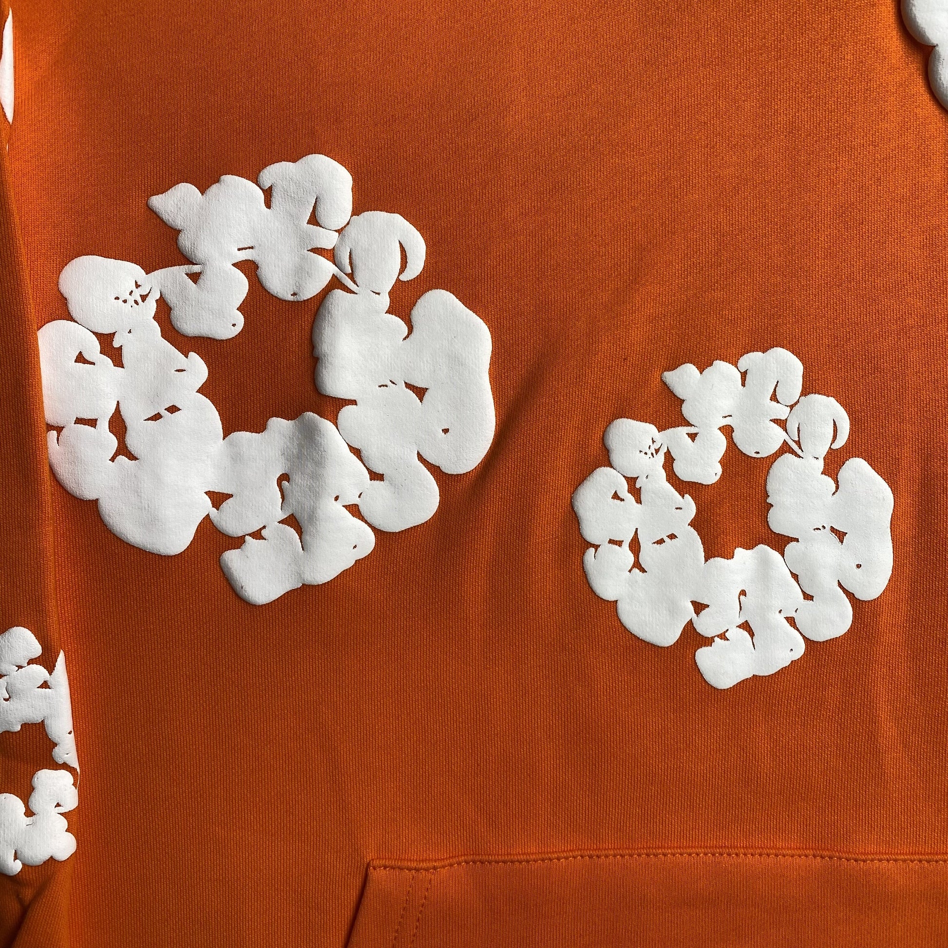 Crafted from premium heavyweight cotton, this hoodie provides a soft, structured feel with an oversized fit, ensuring both comfort and durability. The vibrant orange base contrasts beautifully with the signature white cotton wreath graphic, creating a standout look that commands attention. Designed with ribbed cuffs and hem for a secure fit, along with a spacious kangaroo pocket, this hoodie is both stylish and functional.