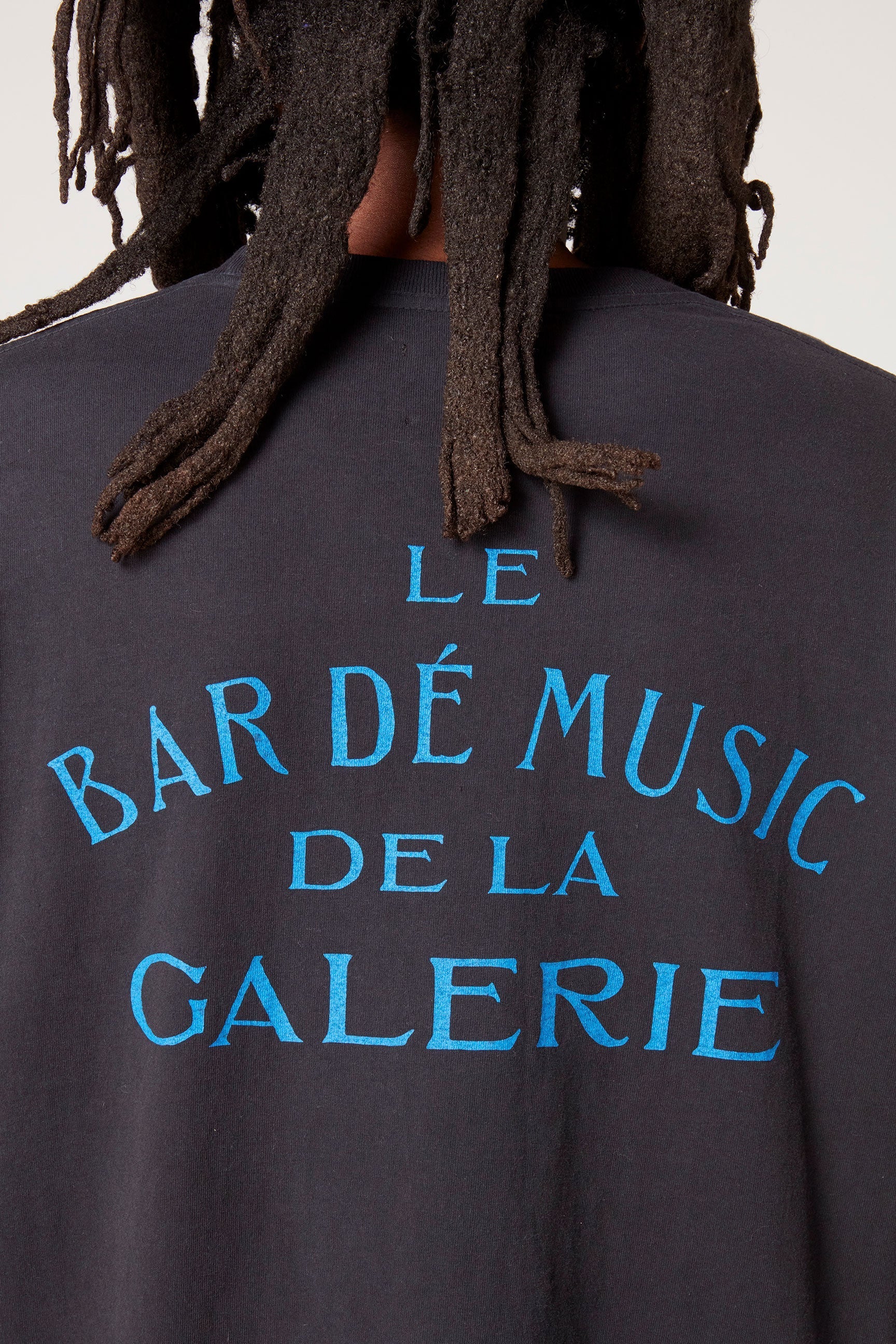 The standout feature of this tee is the striking graphic text that adorns the back and sleeves. The phrase "Le Bar Dé Music De La Galerie" is printed in a vivid blue font on the back, creating a captivating visual contrast against the black fabric. The sleeves are also embellished with complementary text, adding an extra layer of style and detail.