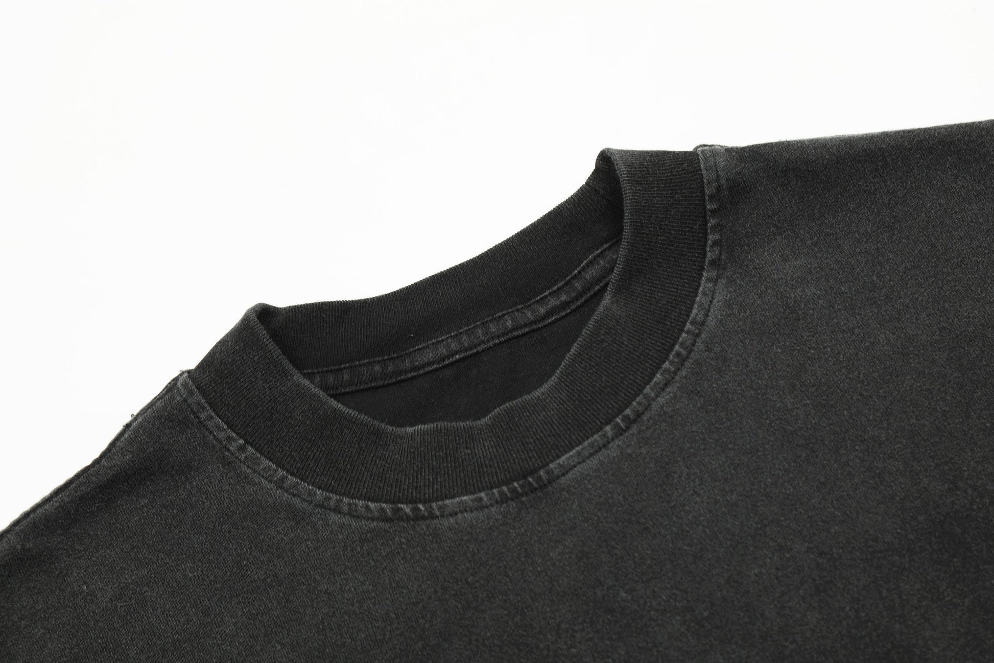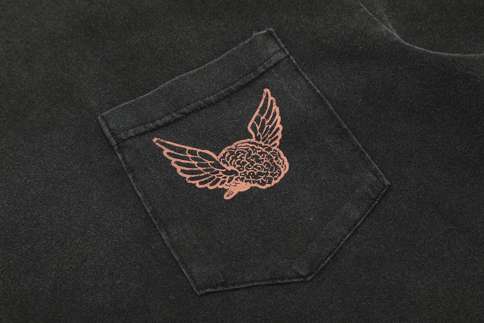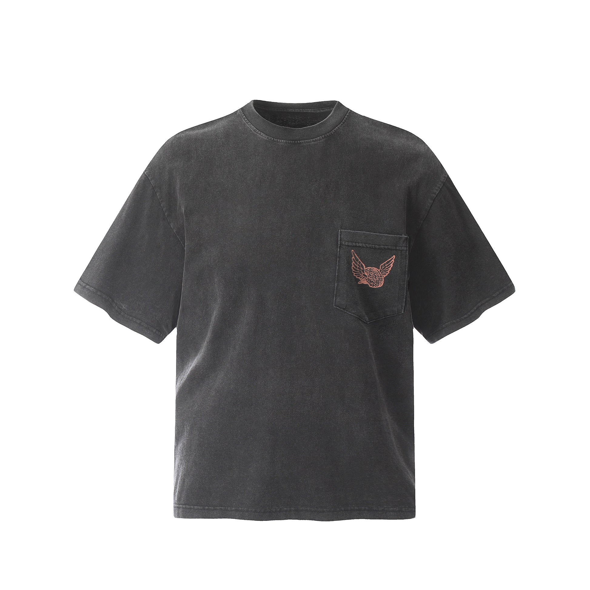 The shirt features a classic crew neck and short sleeves, providing a timeless and versatile silhouette. The washed black color gives it a vintage, worn-in look, adding to its unique character. On the front pocket, you'll find a meticulously hand-painted winged emblem, adding a touch of rebellious charm and attention to detail that Gallery Dept. is known for.