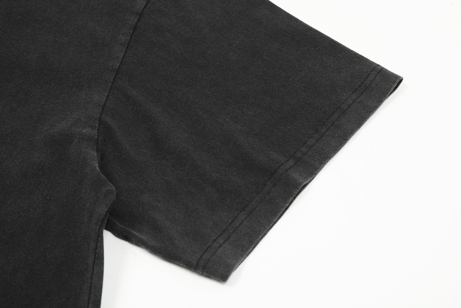 Designed with a classic crew neck and relaxed fit, this T-shirt offers versatility in styling. The distressed detailing adds a vintage touch, giving the T-shirt a worn-in, authentic look that is perfect for fans of retro and grunge fashion. The faded black base color enhances the boldness of the graphic, making it a standout addition to any wardrobe.
