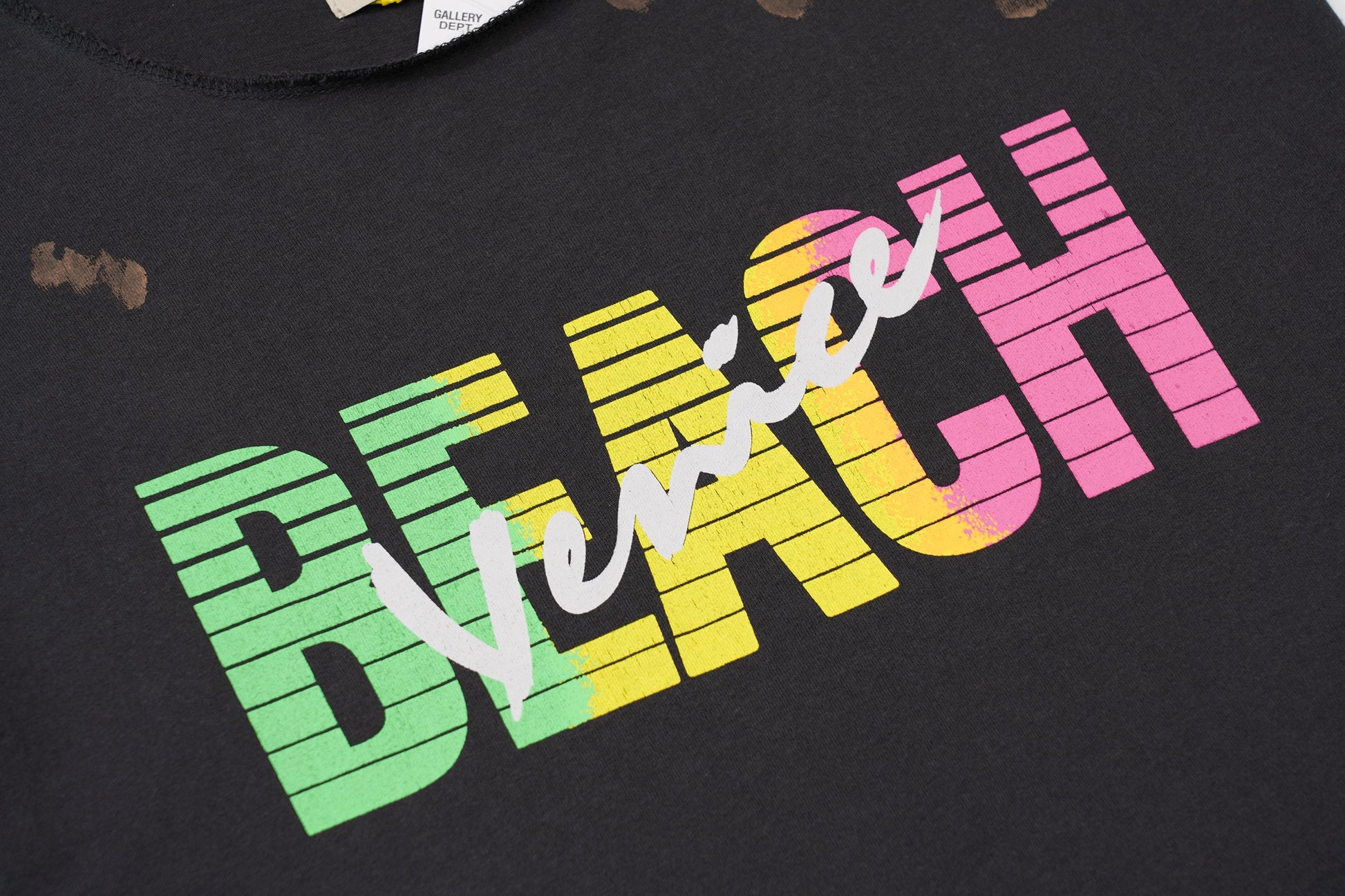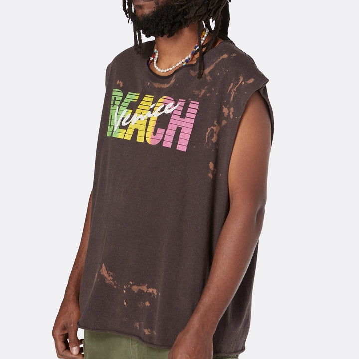 The Gallery Dept. Venice Beach Sleeveless Tee is a perfect blend of style and comfort. This black sleeveless tee features a vibrant "Venice Beach" graphic in multicolored, retro-inspired letters across the chest, giving it a bold and playful look. The text is set against a backdrop of horizontal stripes, adding a dynamic visual element that captures the essence of sunny California beach vibes.