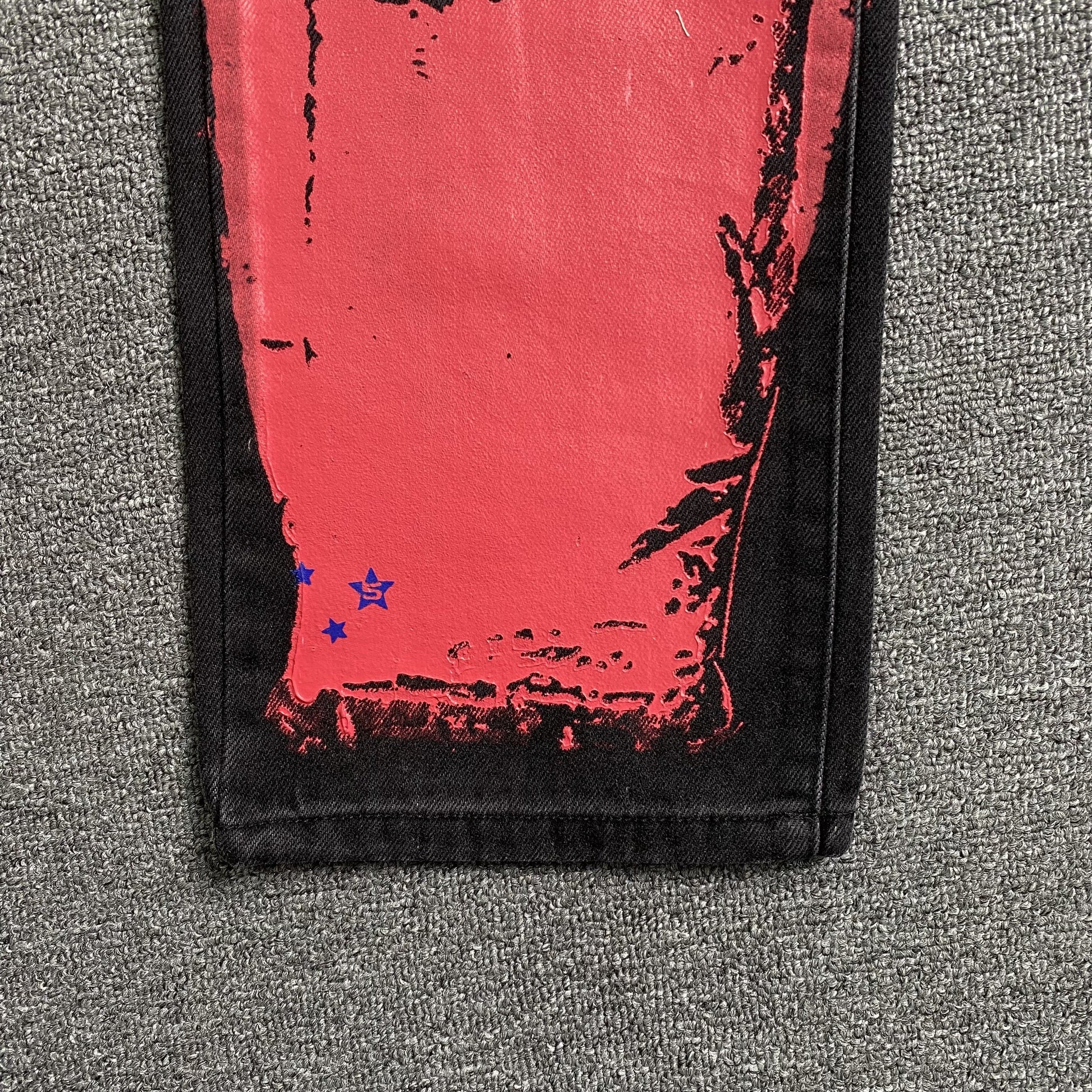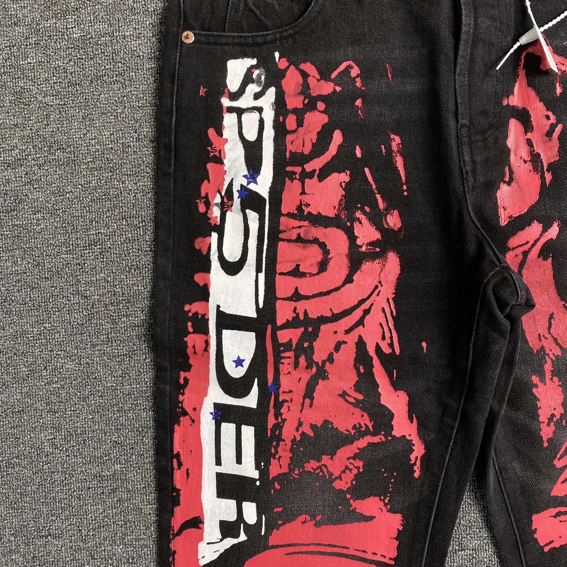 With ribbed paneling and distressed accents, these jeans offer a structured yet relaxed fit, ensuring both comfort and style. The SP5DER branding and unique paint splatter effect make them a standout choice for those looking to elevate their urban fashion game.